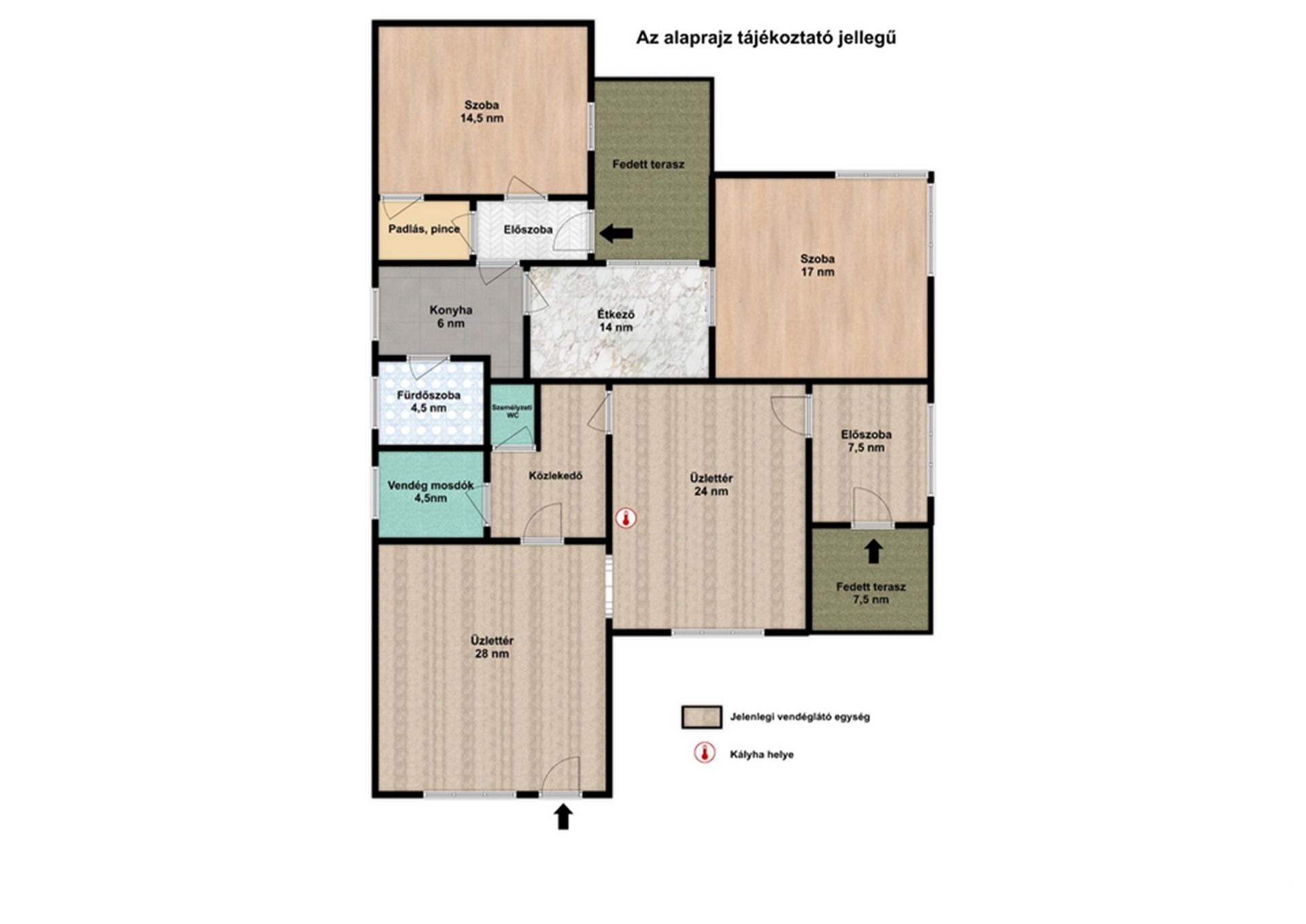 - Egy vendéglátó egységgel: 65 nm, melynek helységei: előszoba, 24+28 nm-es vendéglátó helység, mellékhelyiségek+ terasz és kinti, fedett pihenőrész