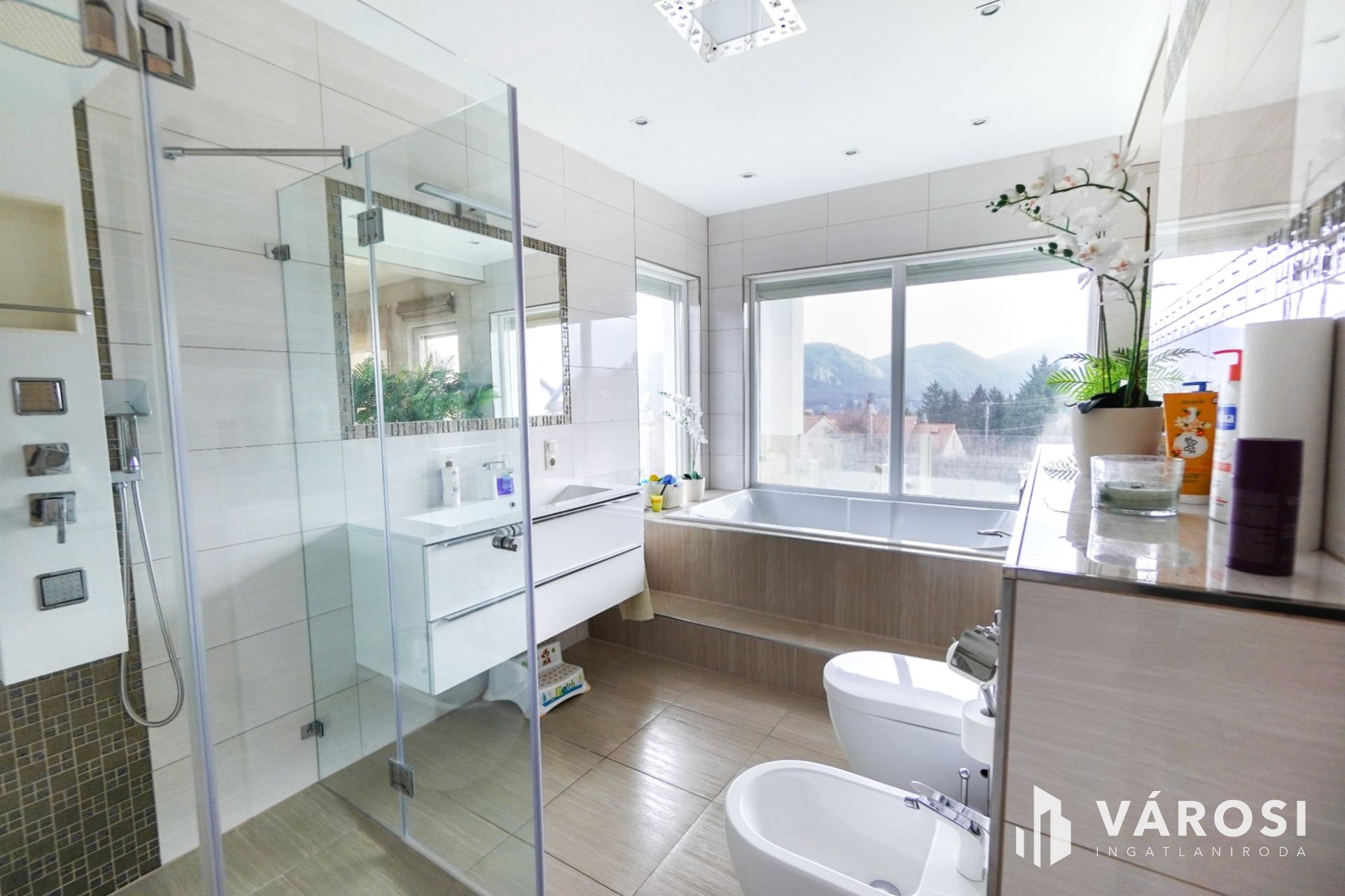 Az emeleti fürdőből egyedülállóan élvezheti a táj szépségeit akár fürdés közben a szintén nagyfelületű ablakoknak köszönhetően. Tágas gardrób, padlófűtés, dekorvilágítás, mosószoba.