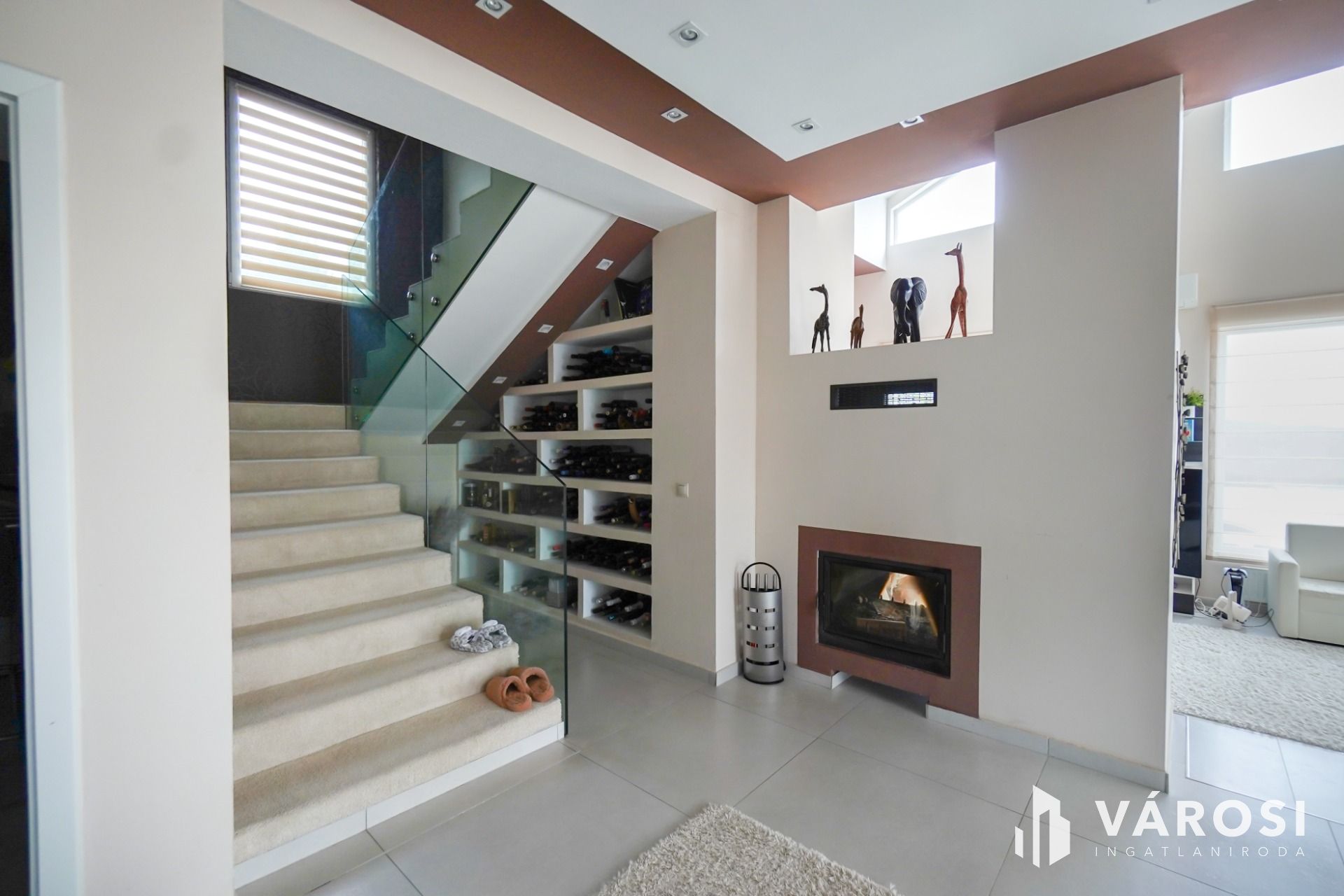 Az épület tágas, világos, a nappali amerikai tipusú loft megoldást kapott, hangulatos kandallóval és természetesen hatalmas üvegfelületekkel. A kilátás az épület minden pontjáról, bármely helyiségéből élvezhető.