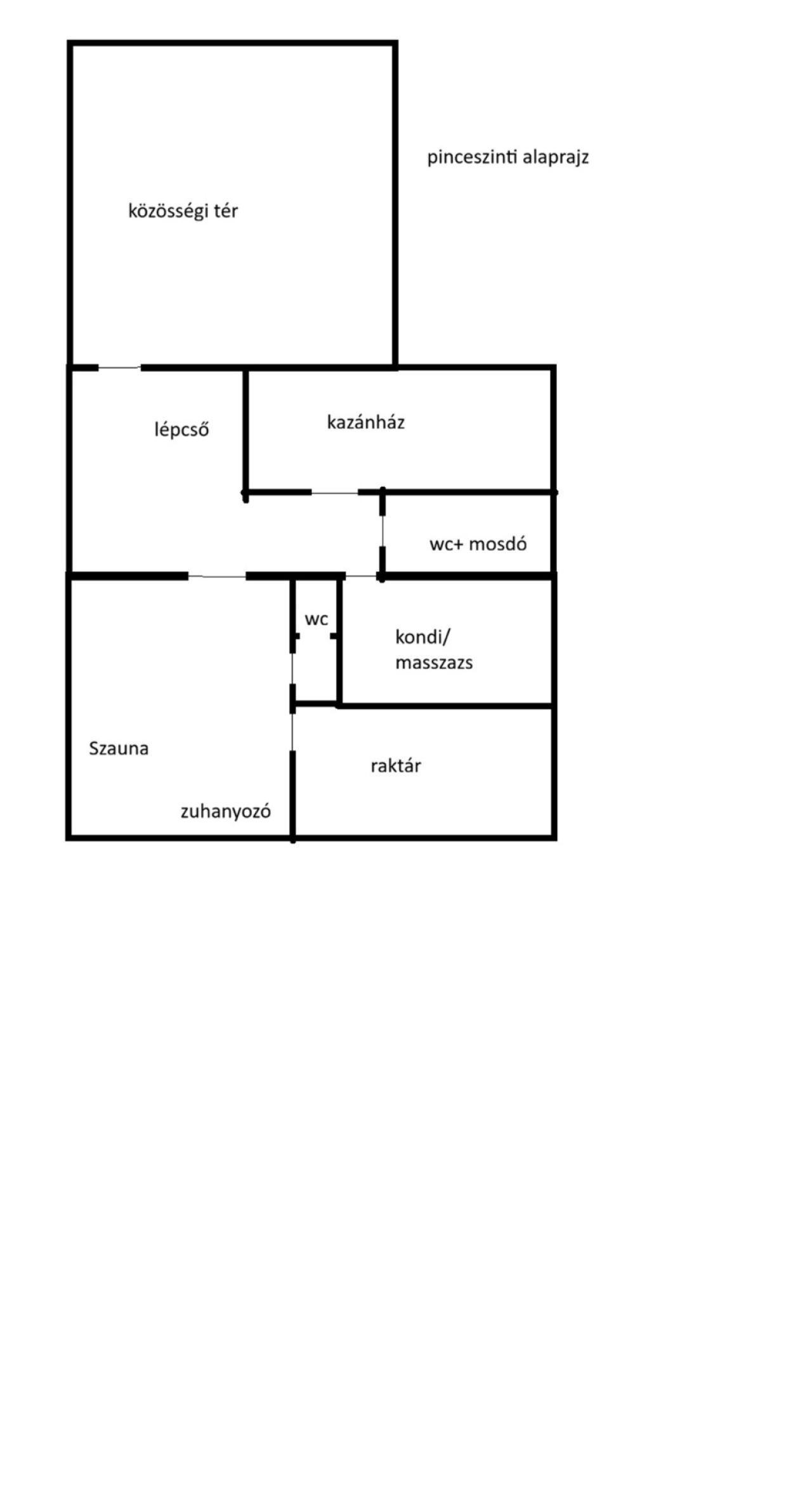 A pinceszinten a közösségi tér mellett helyet kapott a kazánház (nagy teljesítményű gázkazán), raktár és mosókonyha is.