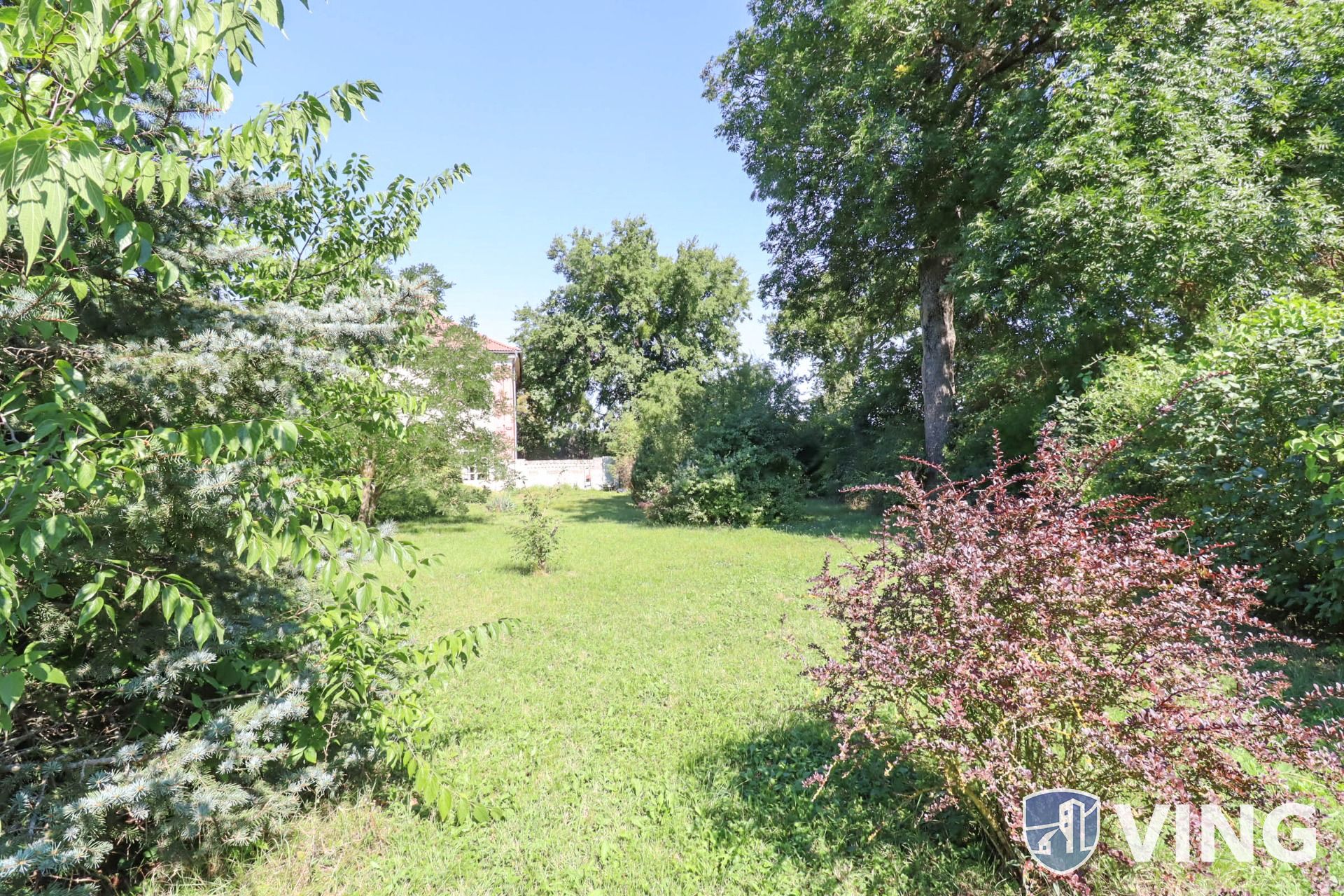 Az ingatlan területén erdős környezetben számtalan zöld növényzet, ős fák, örökzöld található, a telek körbekerített, 2 autó bejáró és 1 személyi bejáró is biztosított.