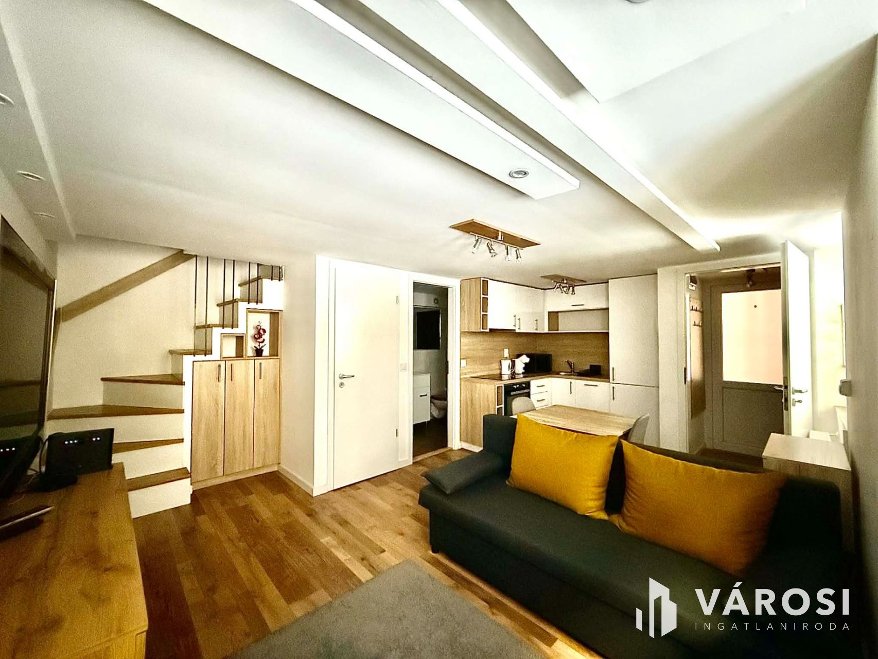 - szintén amerikai konyhás nappali + fürdő + gardrób,
