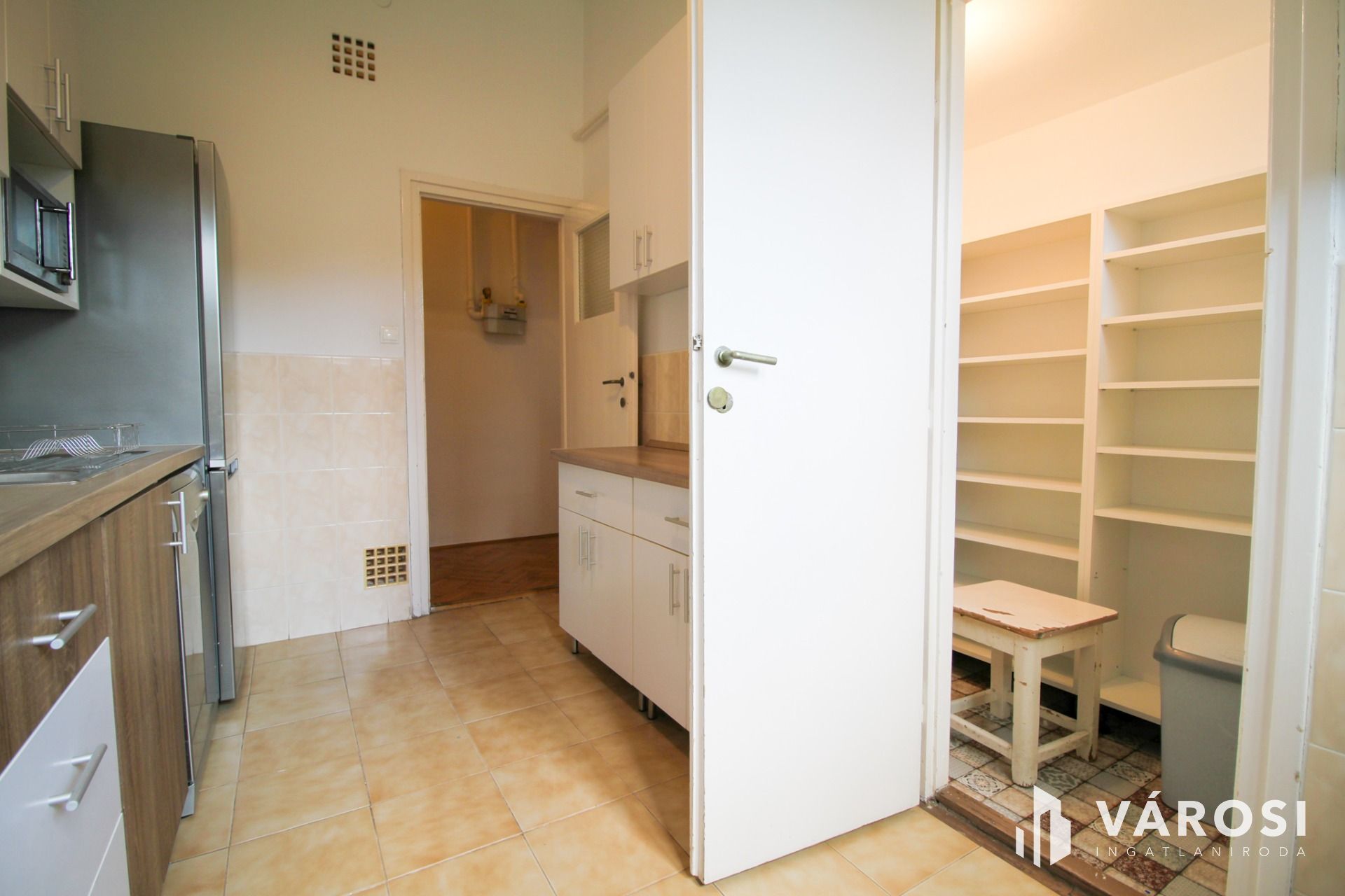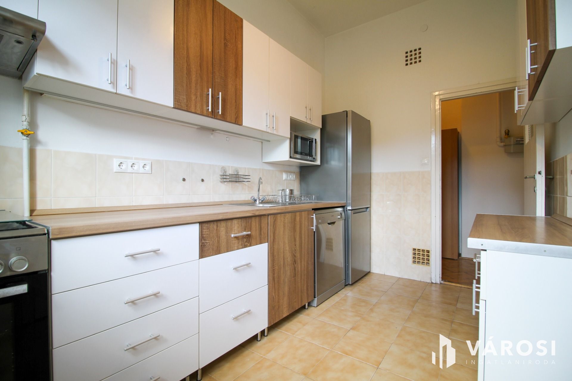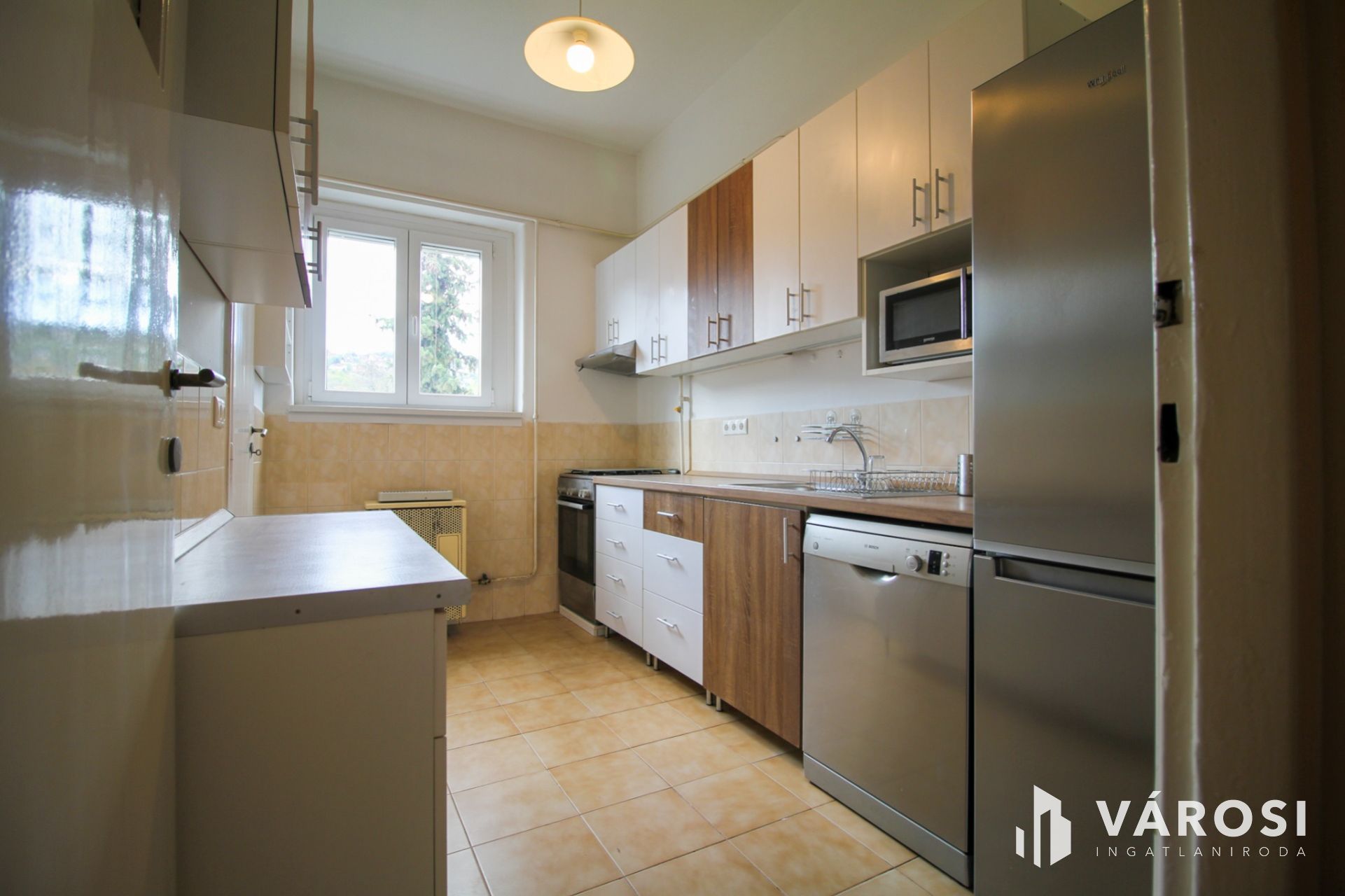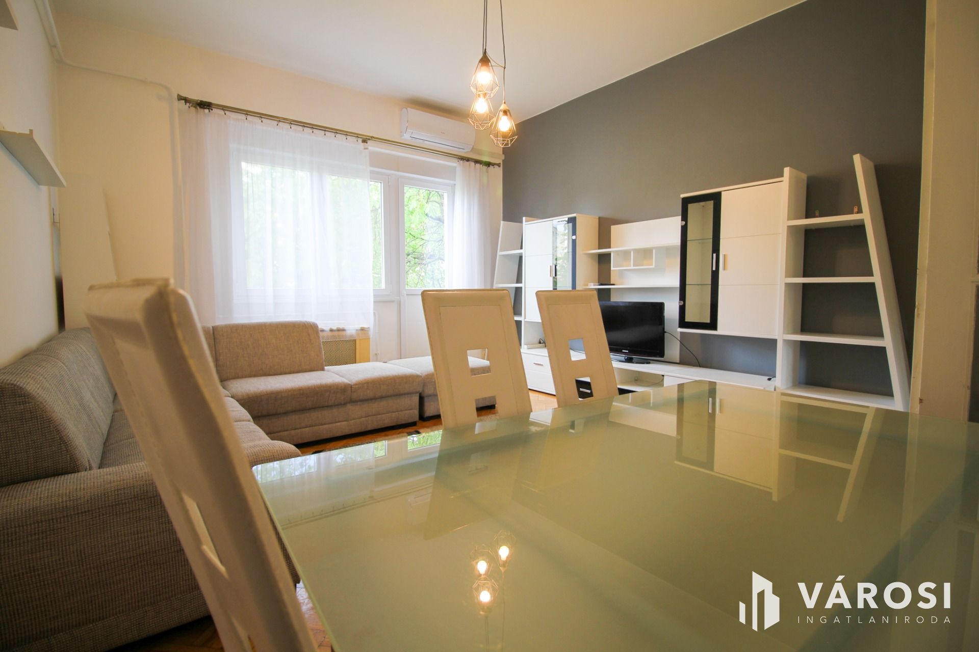 It is available for rent fully furnished and equipped with appliances. The three rooms are designed so that one can be used as a living room, another as a bedroom, and the half-room as a study. The toilet is separate from the bathroom, which features a bathtub. A pantry opens off the modern kitchen. The temperature can be regulated with a gas convector and air conditioning. The doors and windows are new and well-insulated, and the windows have shutters. There are balconies facing west and east; one overlooks an inner courtyard and the Buda Hills, while the other faces a quiet, tree-lined street.