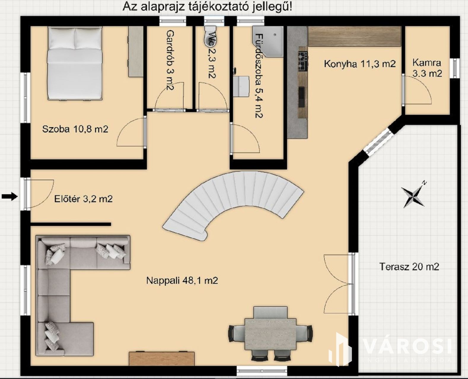A földszint a mindennapi élet központja, ahol a tágas, kandallós nappali természetes találkozópontként szolgál. Innen közvetlen kapcsolat nyílik az étkezőre és a jól felszerelt konyhára, amely minden igényt kielégít beépített gépeivel, bőséges tárolóival és külön kamrájával. A földszinten ezen felül egy külön szoba, vendégszoba, fürdő, külön WC, gardrób és egy fedett terasz is helyet kapott, amely közvetlenül kapcsolódik a kerthez.
