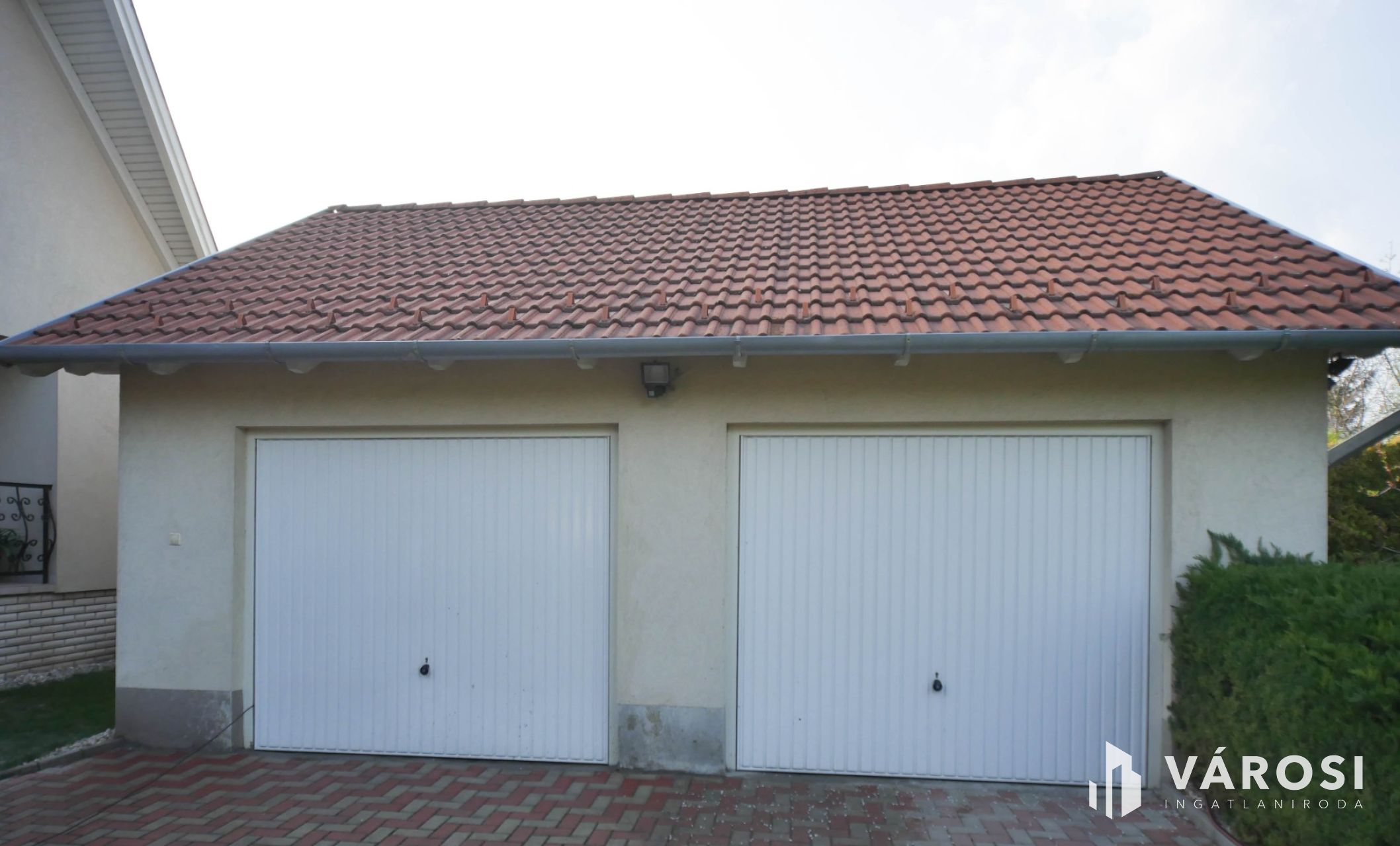 Az udvarban különálló, téglaépítésű, cserépfedésű dupla garázs található, előtte térkövezett beállóval, amely további járművek parkolását is lehetővé teszi a zárt területen belül.