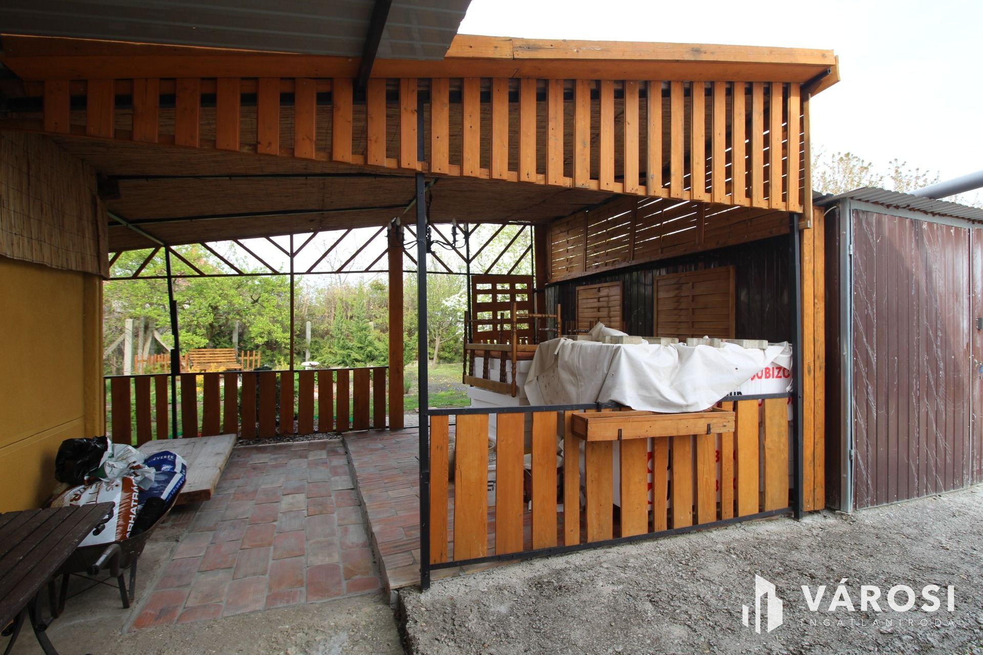 Jelenleg a vendégek számára kialakított parkolók és egy fedett terasz, tároló helyiség valamint 3 garázs kapott helyett, hátul kellemes pihenőkert résszel.