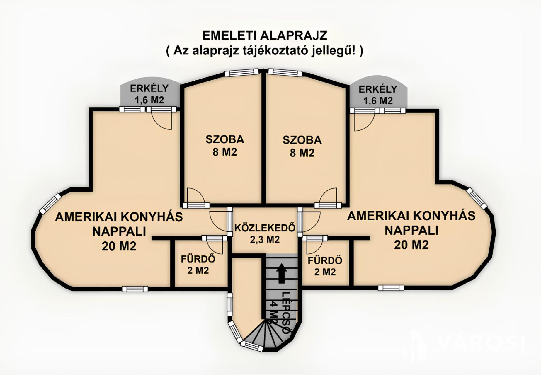 - Felső szint: 2 db 40 m2-es, külön bejáratú apartman, mindkettőben nappali-étkező-konyha, 1 hálószoba és fürdőszoba WC-vel.