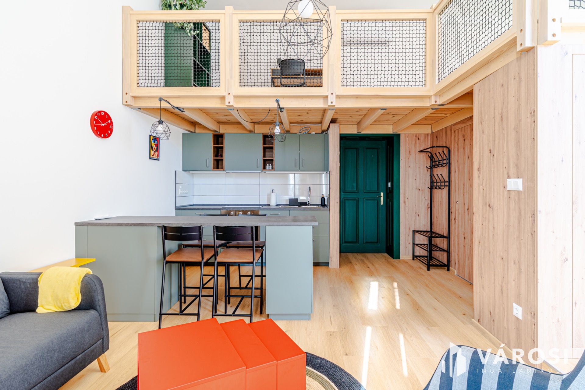 A kisebb lakás (35 m² + 13 m² galéria) galériás megoldással, kreatív beépítésekkel és modern dizájnnal.