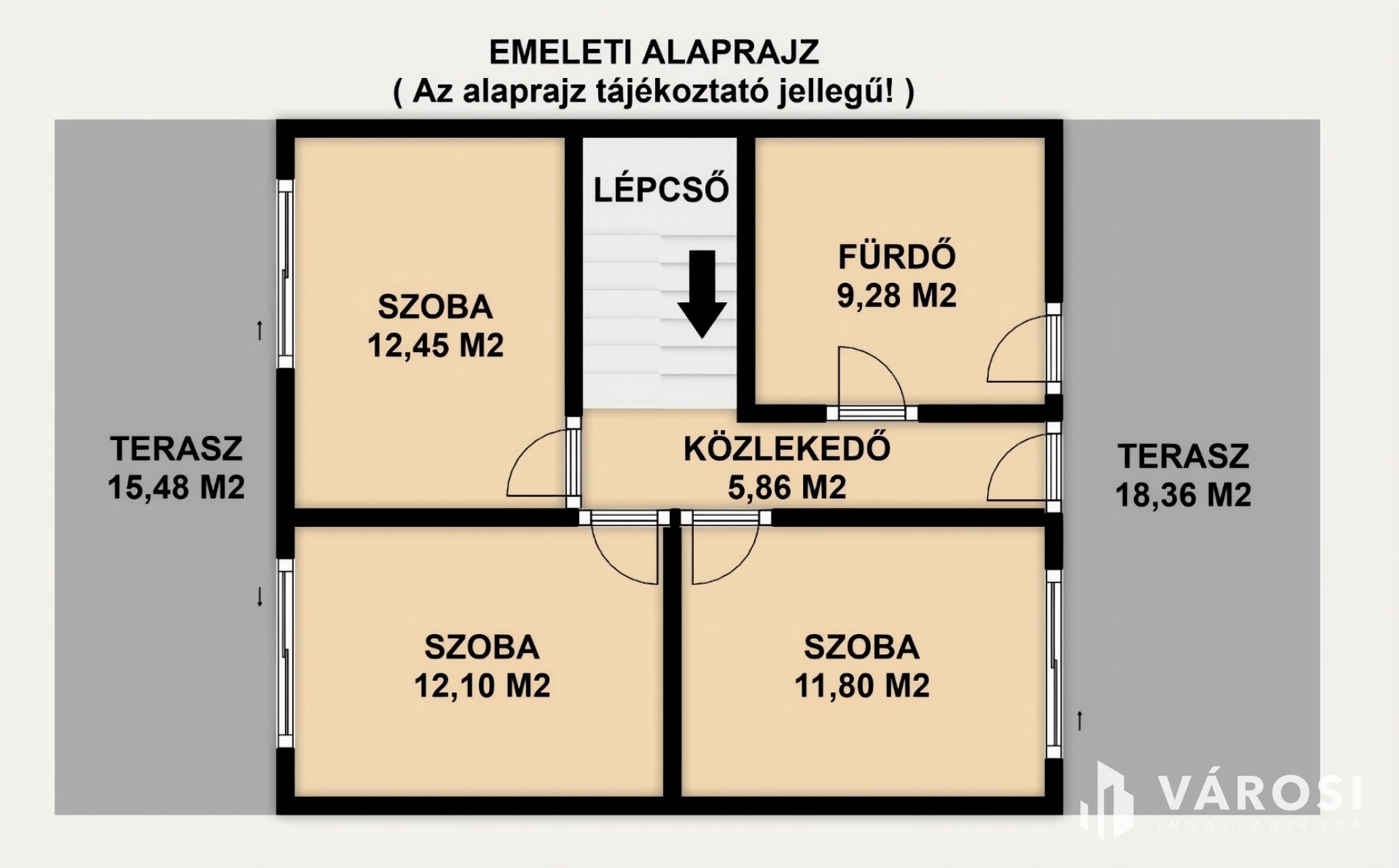 A privát szférát három világos hálószoba és egy tágas, modern fürdőszoba biztosítja. Különlegessége a két nagyméretű terasz, amelyek az emeleti szobákból közvetlenül megközelíthetőek, tökéletes helyszínt biztosítva a reggeli kávézáshoz, vagy az esti kikapcsolódáshoz.