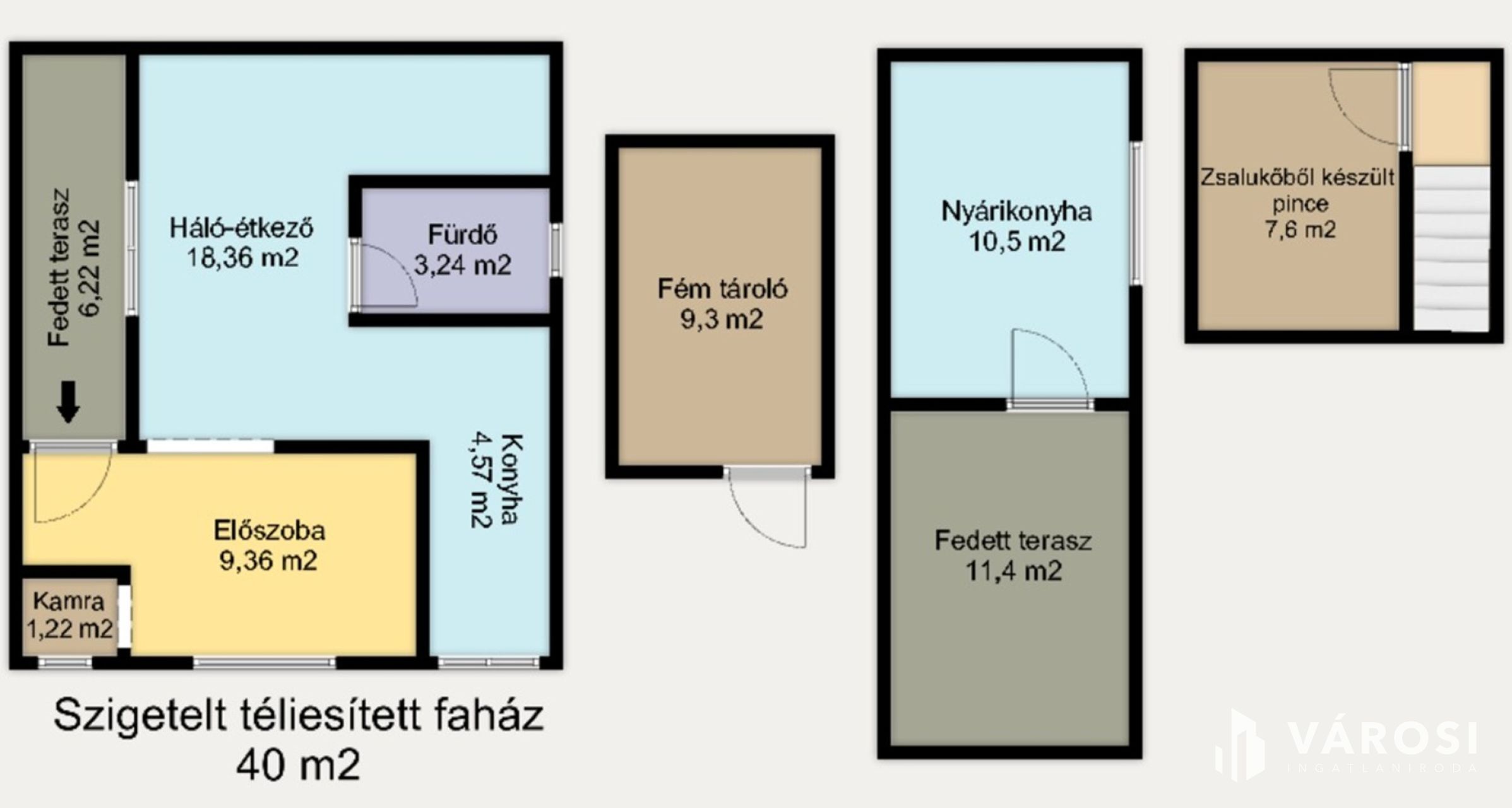 A faház teteje palával és lemezzel borított, a nyári konyha teljesen lemeztetős, a pince pedig zsalukővel, betonból készült, teljesen száraz, tárolásra alkalmas.