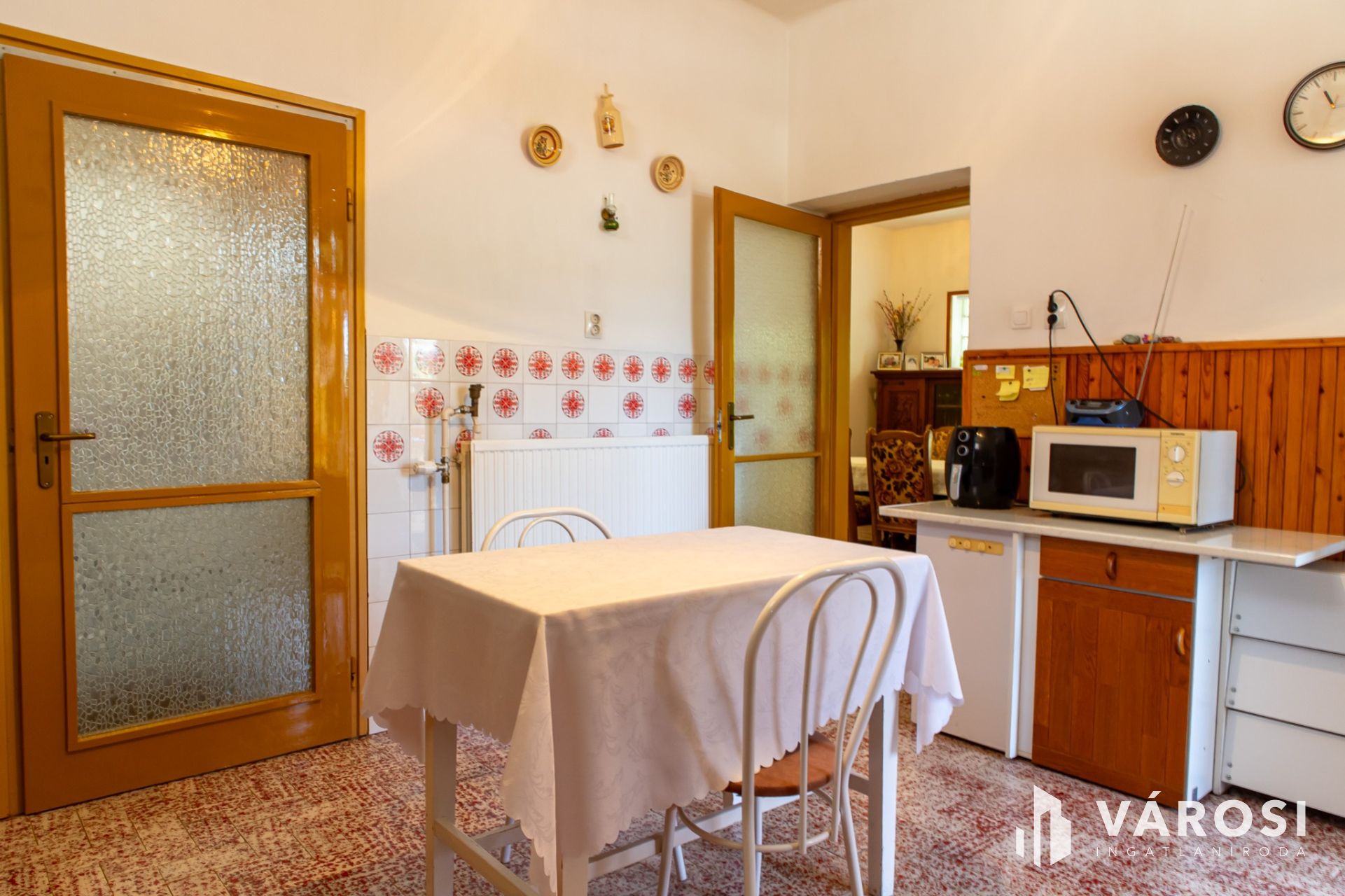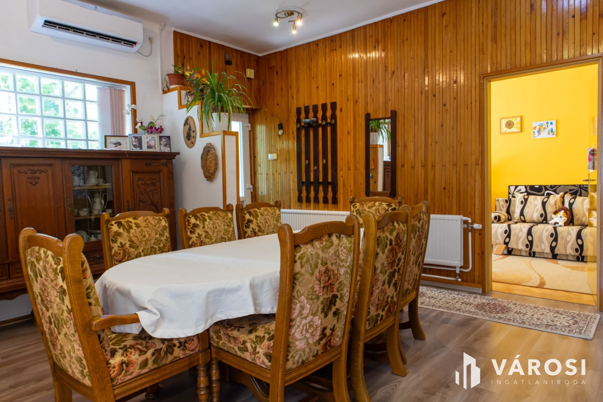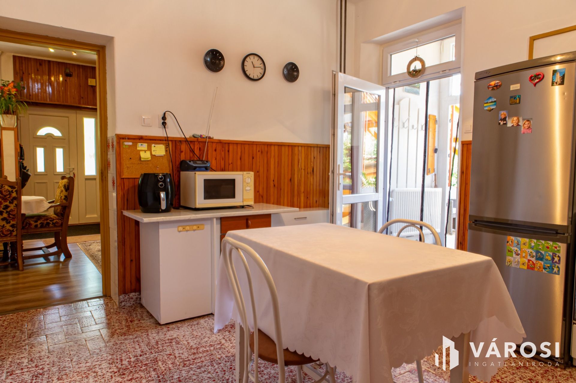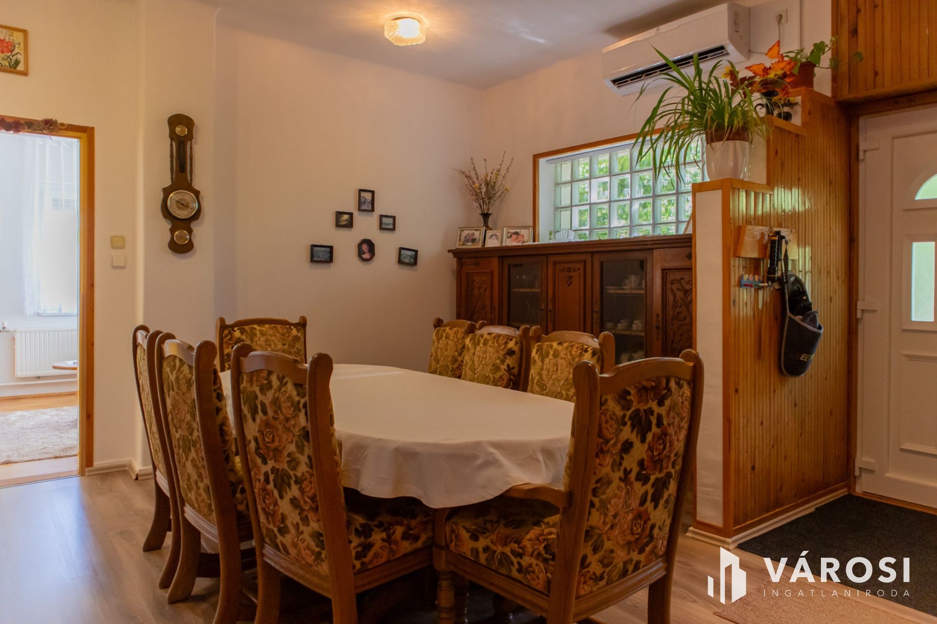 Its central room is the friendly dining-living room, where the family can really gather. In addition to the dining room, there are 3 rooms, a bathroom, a separate toilet, and a large kitchen. At the main entrance we arrive at the large living-dining room, from where the 3 rooms and the large (14 m2) kitchen open. The rooms are bright, the windows have mosquito nets and shutters.