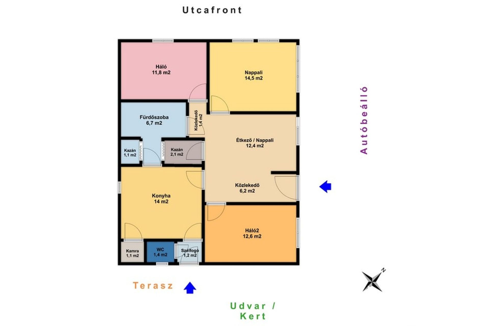 A ház a 604 m2-es területű telek É-K-i részét foglalja el kb. 90 m2-es belső alapterülettel. A ház 2 bejárattal rendelkezik, a főbejárathoz pár lépcső vezet fel, az udvarról megközelíthető bejárat egy lenti kiülőn és egy kellemes fedett teraszon keresztül érhető el. A 7,5 m2-es teraszról ráláthatunk az udvarra, a kertre.