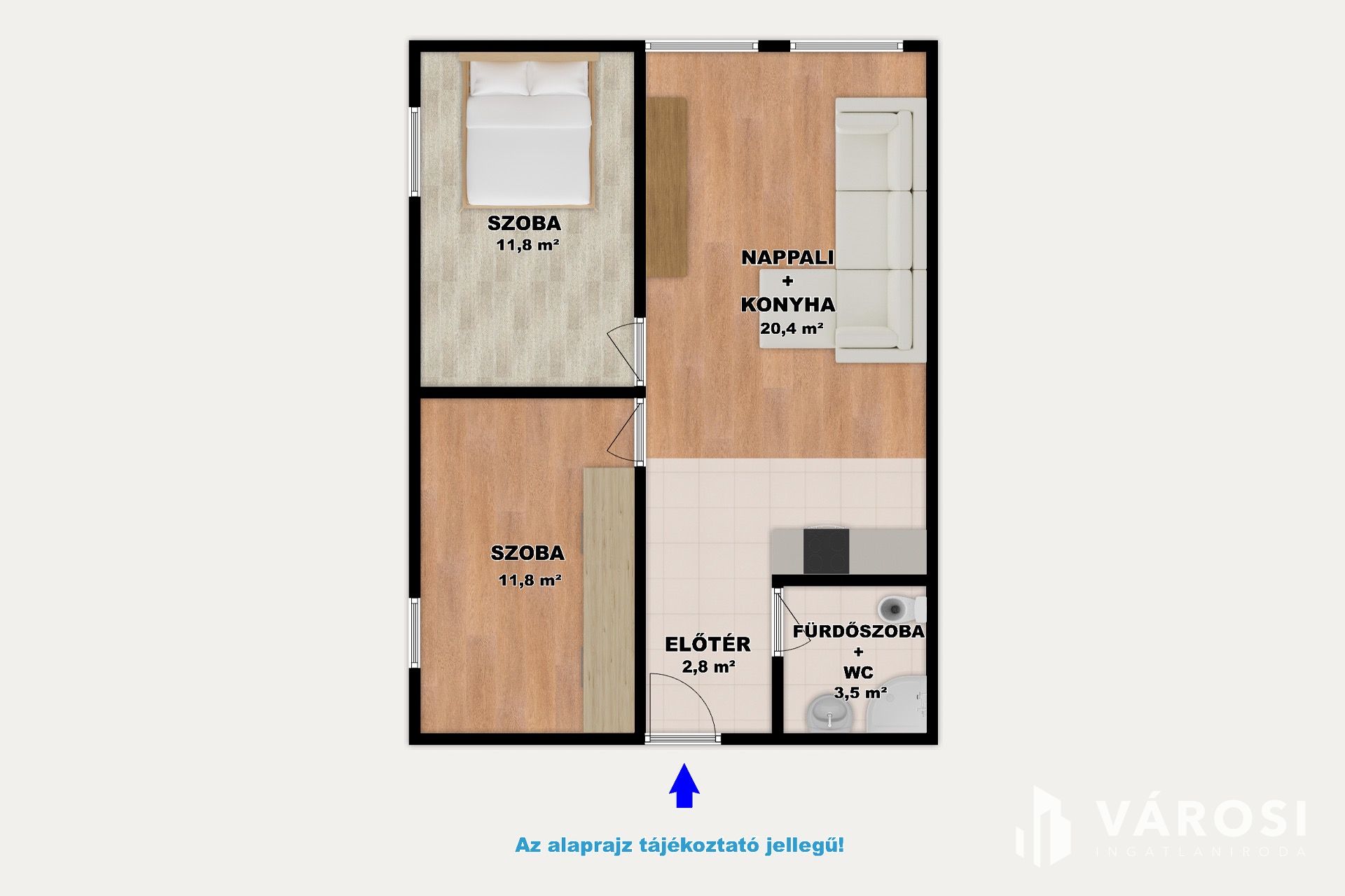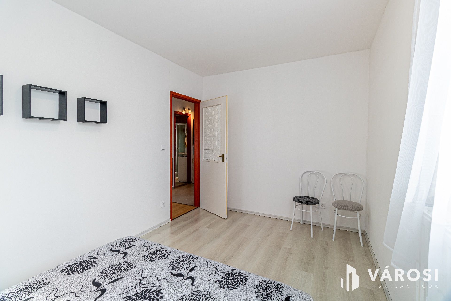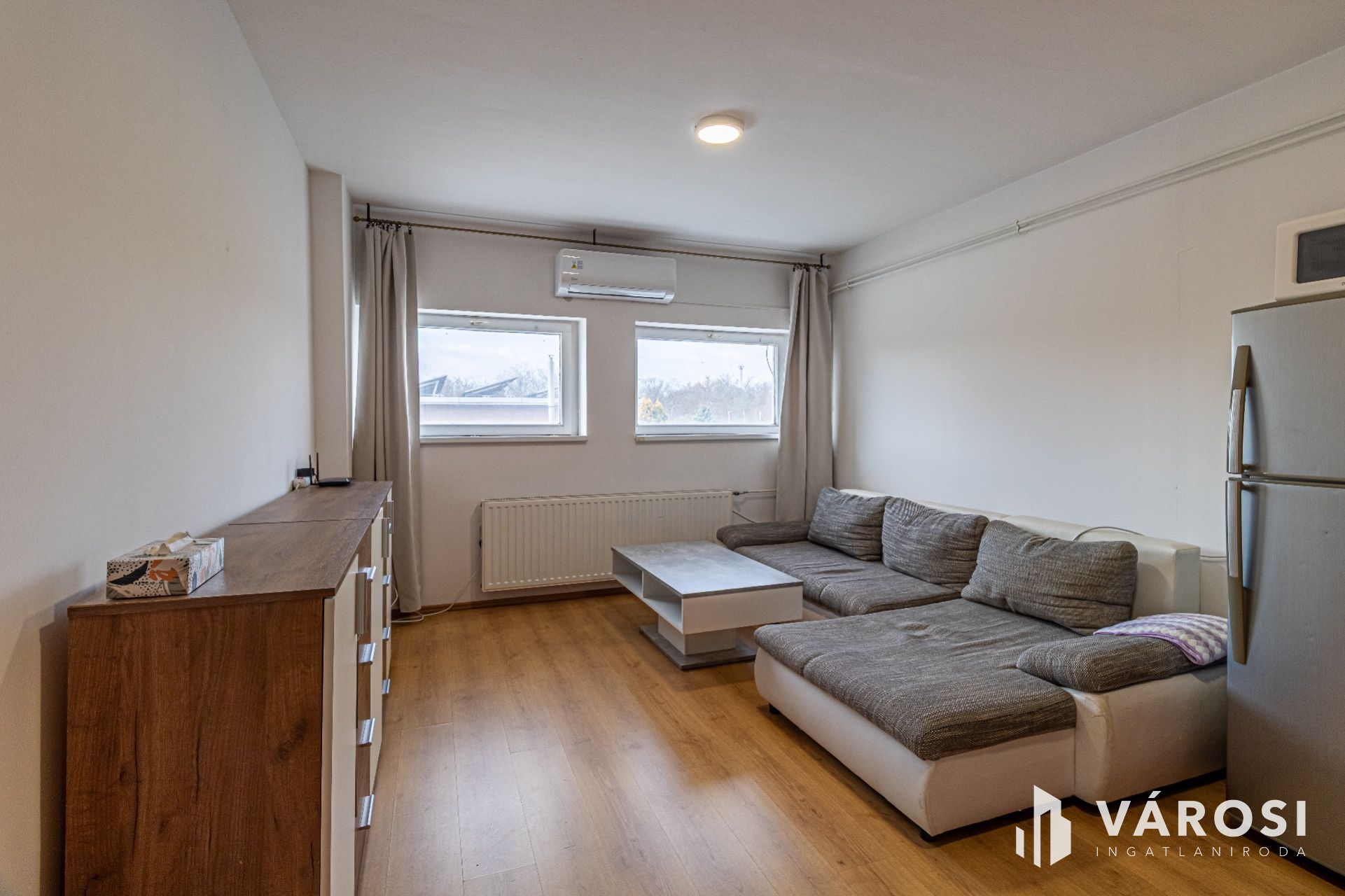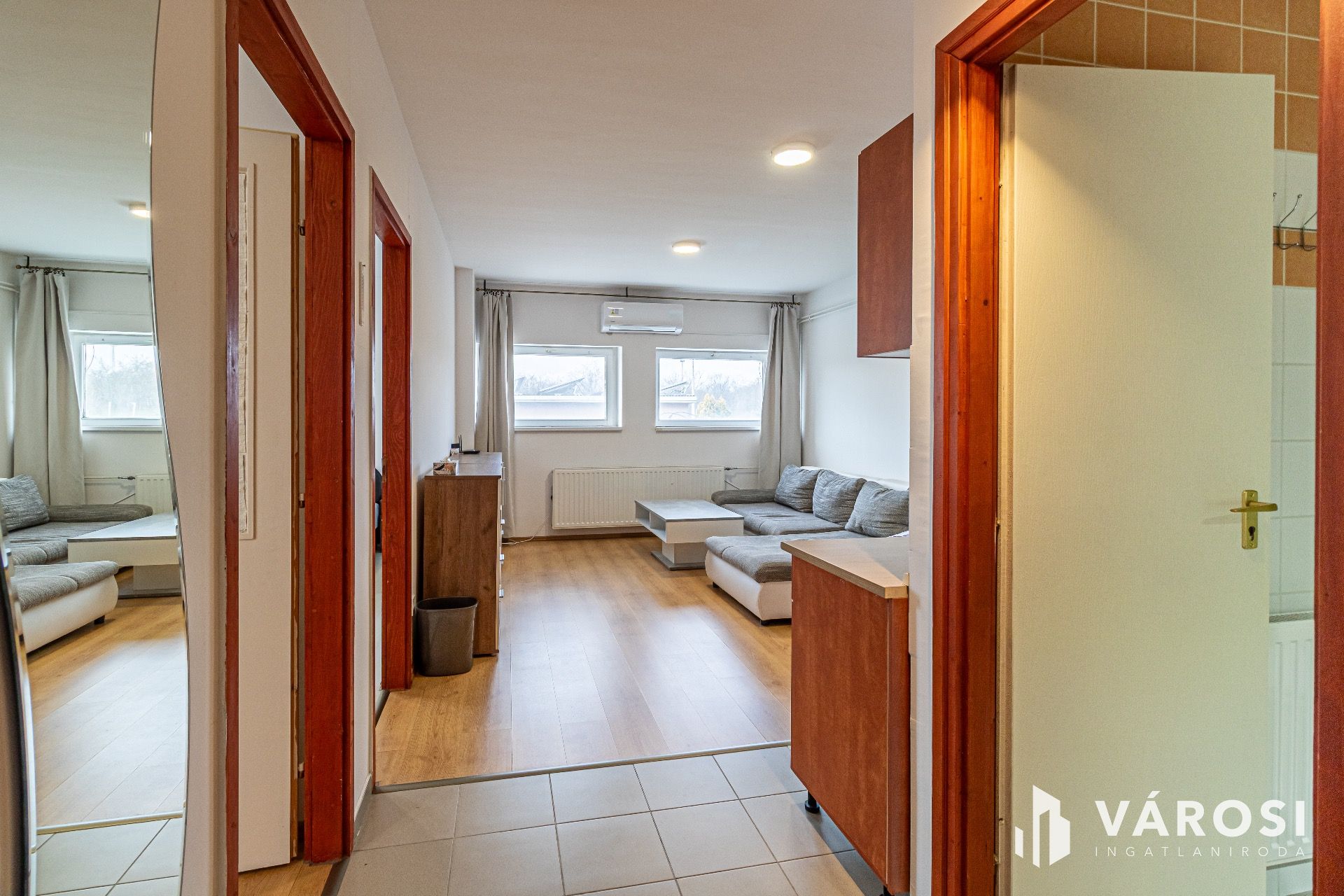 A lakás elosztása praktikus: kettő szobából, egy nappaliból, egy amerikai konyhából és egy fürdőszobából áll. A modern igényeknek megfelelően az ingatlan klímával felszerelt, és a villamoshálózat is nemrégiben került felújításra, ami hozzájárul az alacsony fenntartási költségekhez.