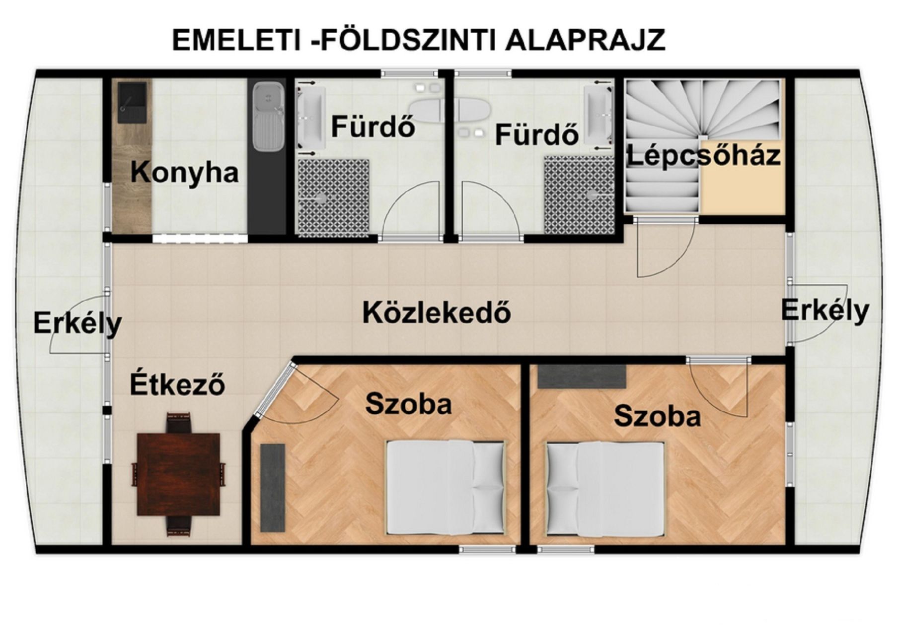 -földszinten: nappali(étkező), 2 fürdőszoba, konyha és 2 lakószoba