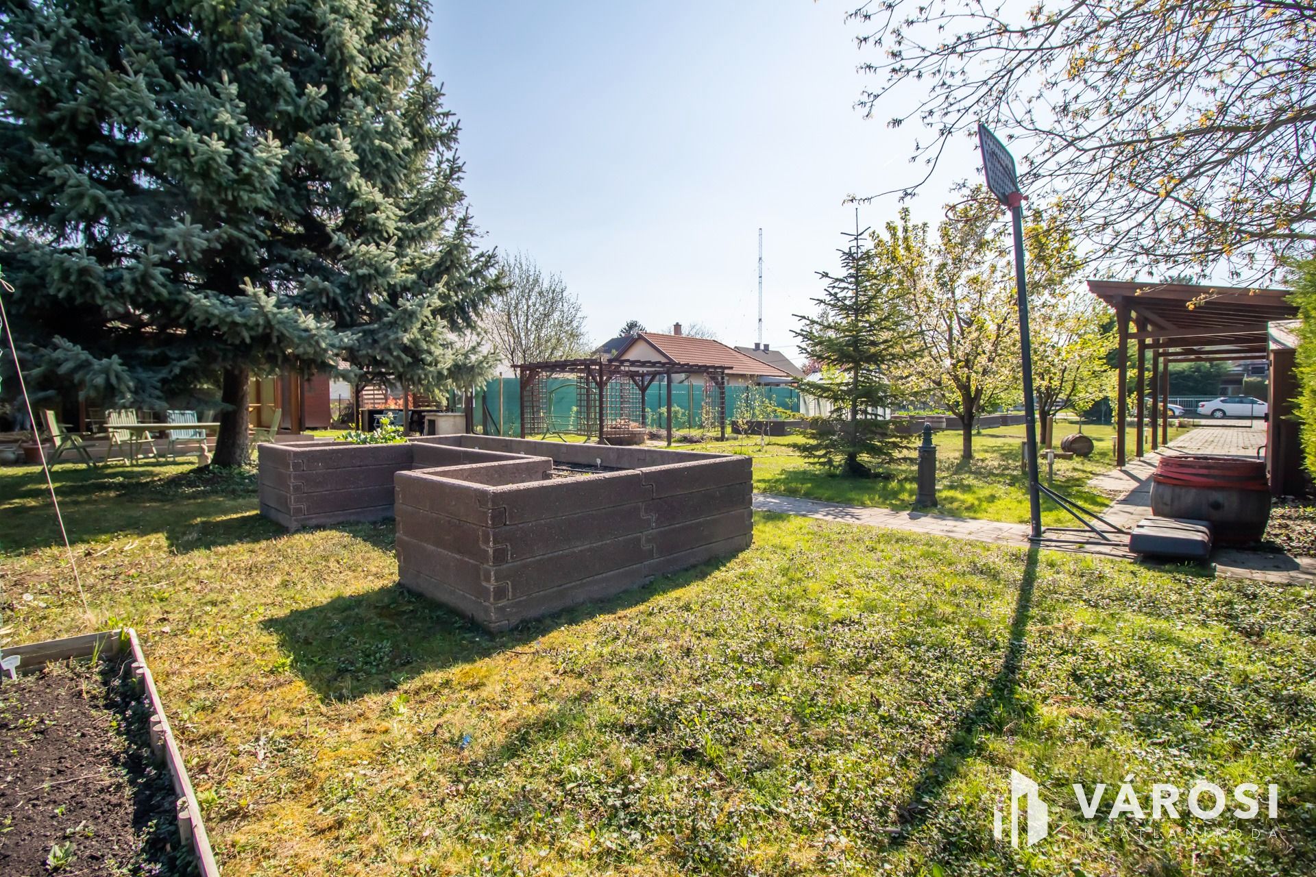 A házhoz tartozó kert és az 501 négyzetméteres másik telek is szépen parkosított. Magaságyások és üvegház biztosítják az itt lakók egész éves zöldségszükségletét. A locsolásról saját fúrt kút és kiépített öntözőrendszer gondoskodik. Becsült piaci értéke körülbelül 45-50 mFt.