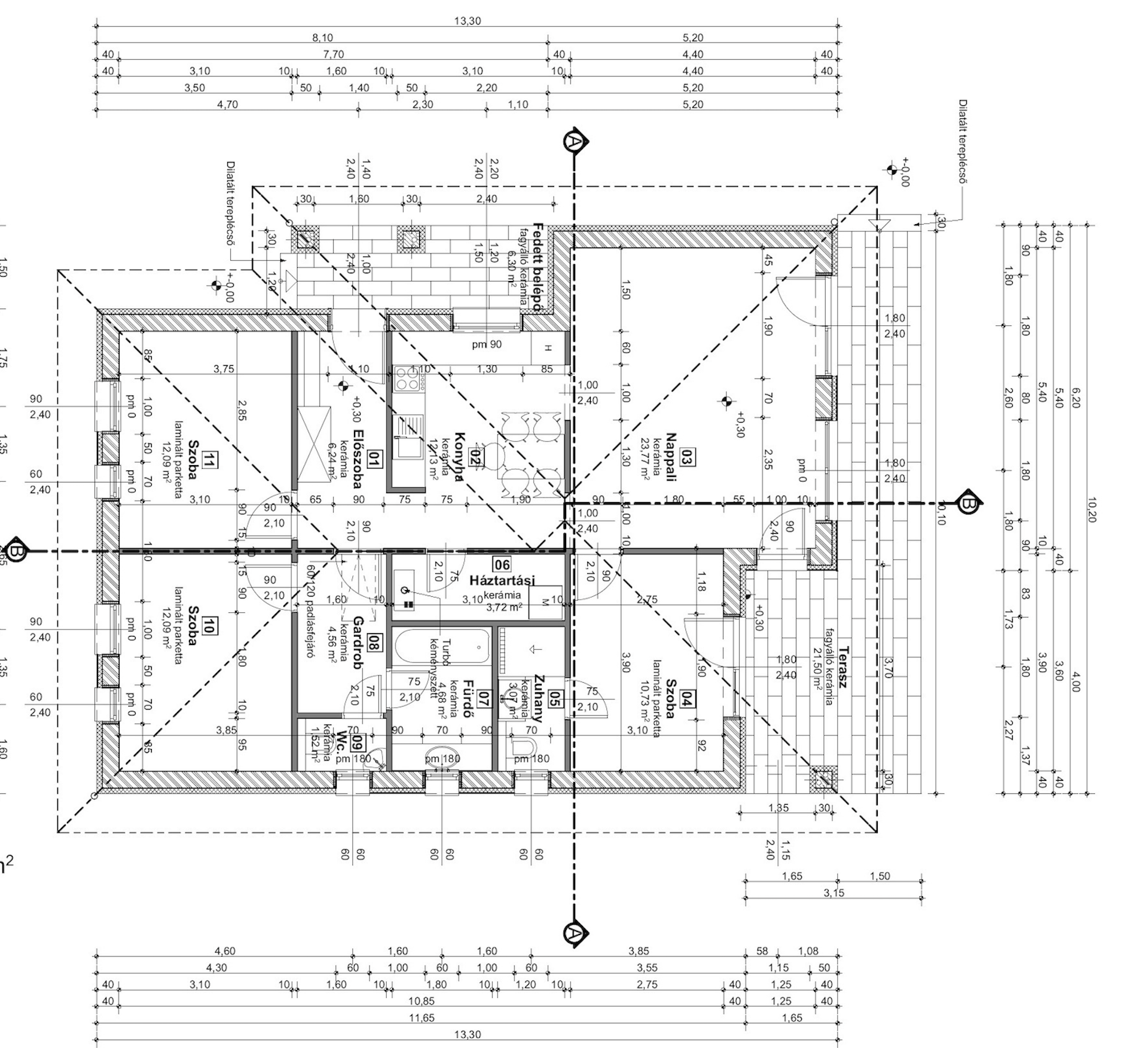- 30 cm kerámia csiszolt tégla falazat, 10 cm grafitos hőszigeteléssel, fehér nemesvakolattal