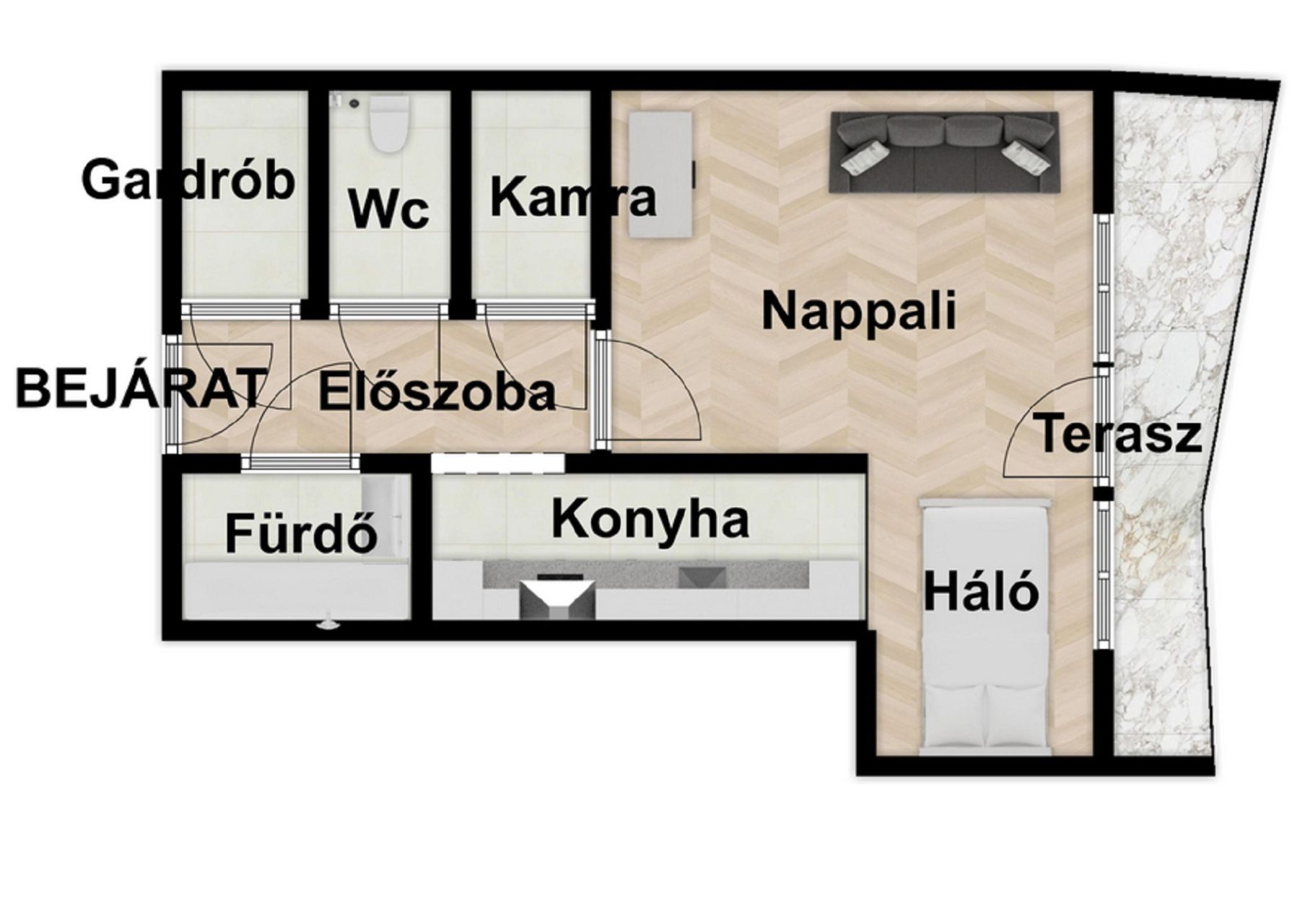 -47nm-es lakás(konyha, nappali, félszoba, fürdőszoba, kamra és egy különálló wc)