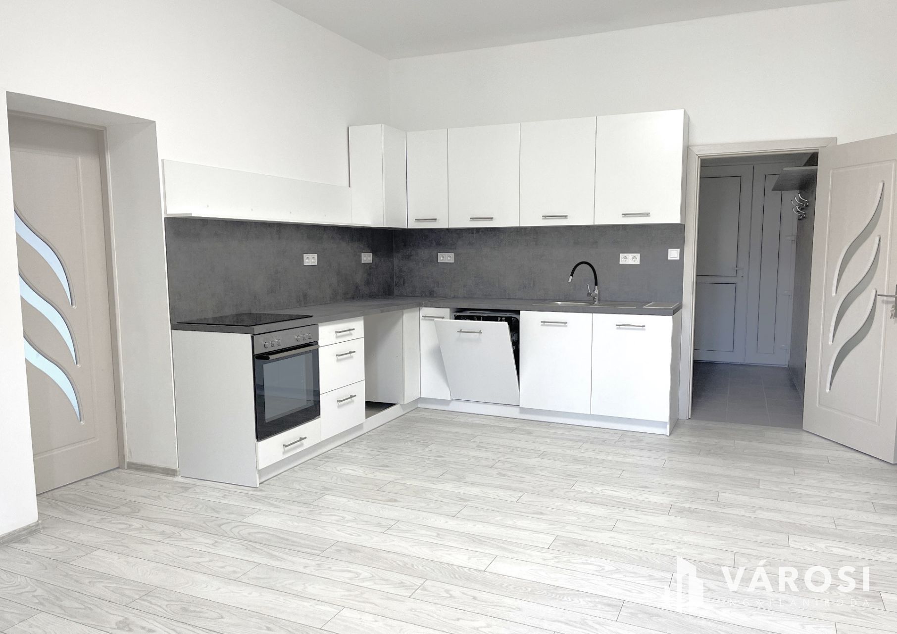 A komfortos, modern 77 m2-es lakás tágas nappali-konyhával rendelkezik, ahol már beépítésre került az egész konyhasarok az elektromos tűzhellyel, főzőlappal, mosogatógéppel felszerelve. A két hálószoba külön és egymásból is nyílik, a fürdőszobában tusoló és WC találhat. Az egyik szoba még egy kis kuckót is rejt, ami lehet egy pakoló hely vagy gyerekeknek játszószoba.