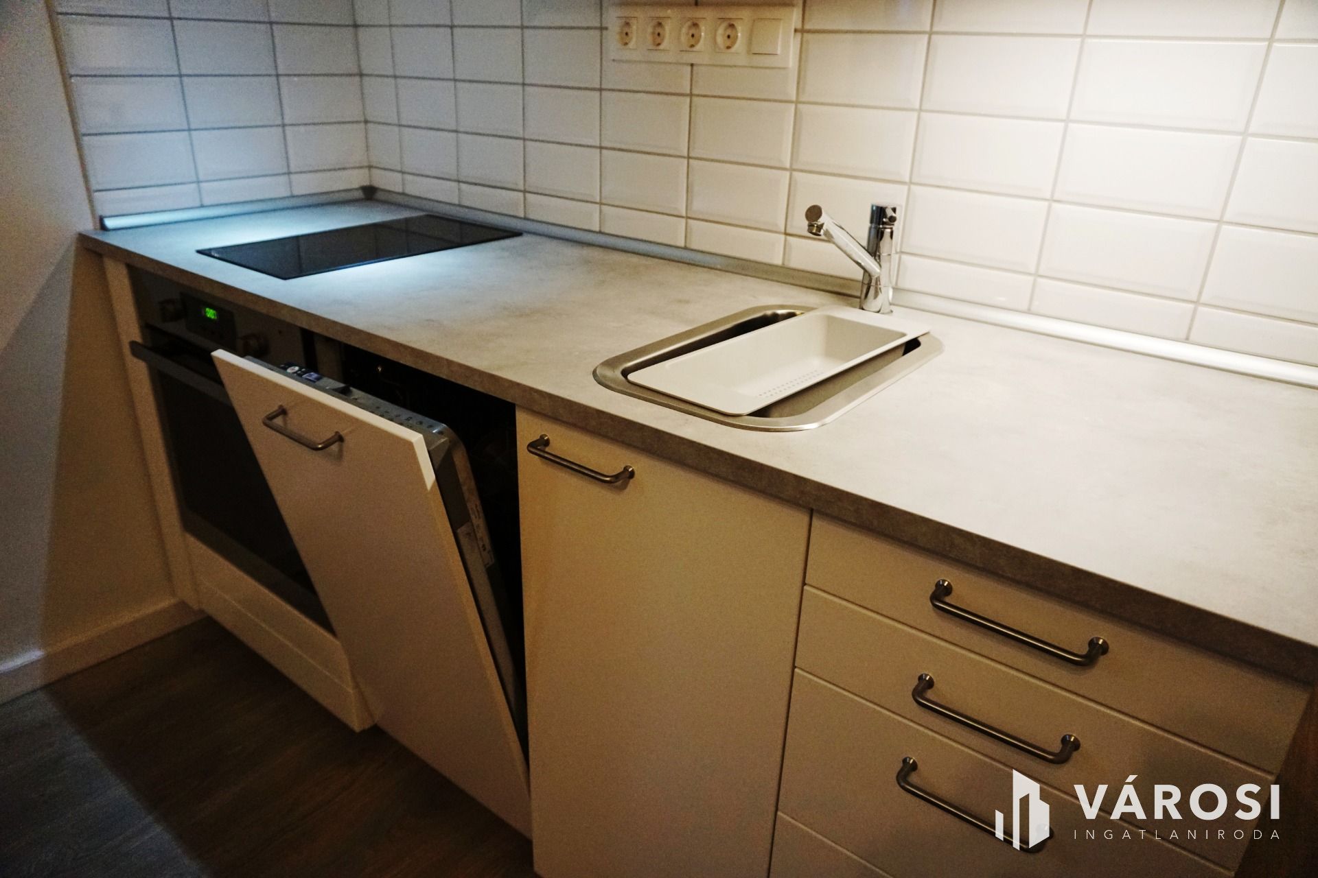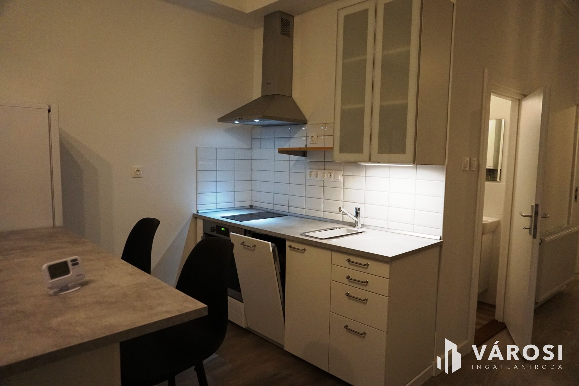 A homogén színeknek köszönhetően valóban tágassá vált a nappali + konyha, melyet egy étkezőpult választ el. A nappaliban elhelyezett kanapé kihúzható. A konyha teljesen felszerelt (hűtőgép, mosogatógép, pára elszívó, sütő).