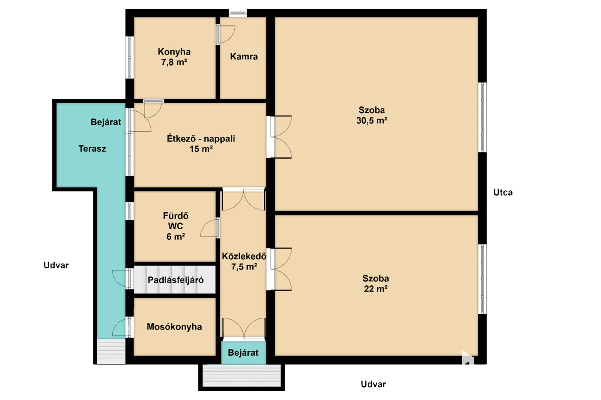 - Szobák: 30,5 m², 22 m²