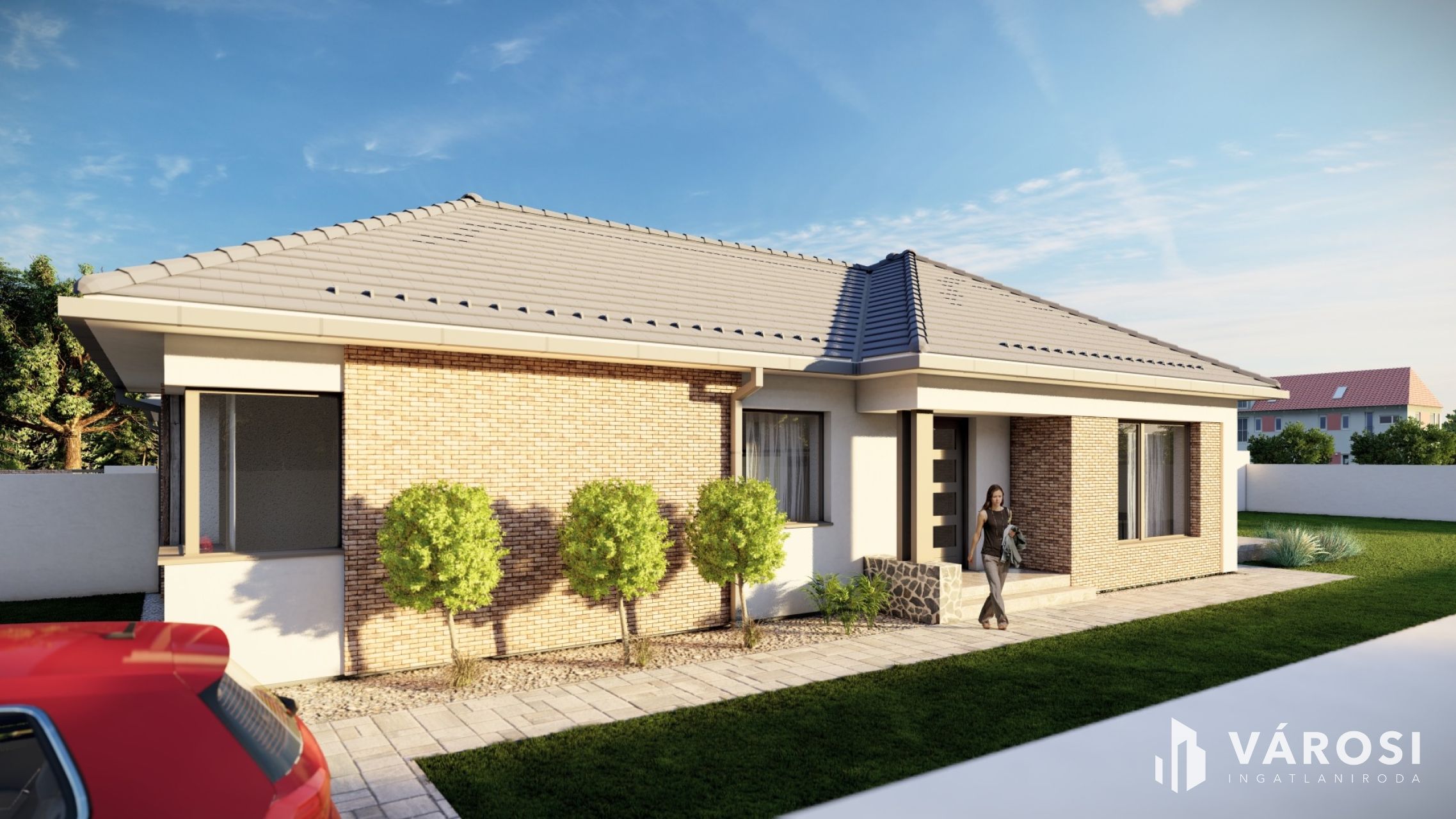 A házban tágas amerikai konyhás nappali + 3 kényelmes szoba, gardrób, valamint külön fürdő és WC kap helyet.