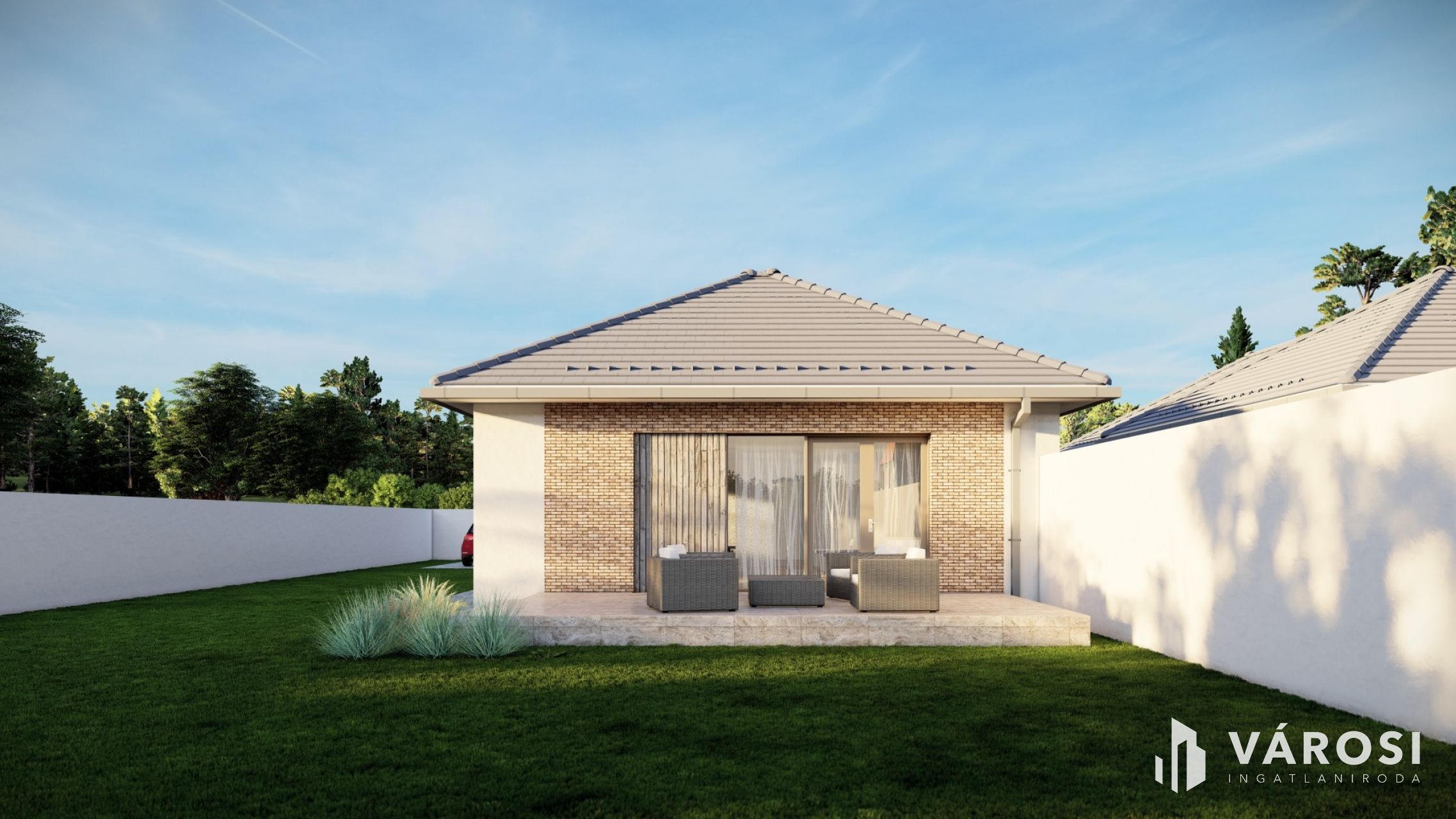 A nappaliból közvetlen kijárás nyílik a hangulatos teraszra, ahol élvezheti a pihenést a zöld kertkapcsolatnak köszönhetően.