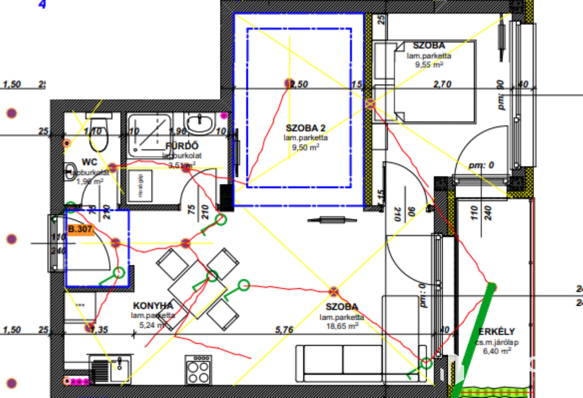 Ez a lakás a társasház második emeletén található (B307), 51,72 nm hasznos alapterülettel rendelkezik. A lakótér helyiségei: konyha nappali étkezővel, 2 szoba, fürdőszoba, wc, erkély, előtér.