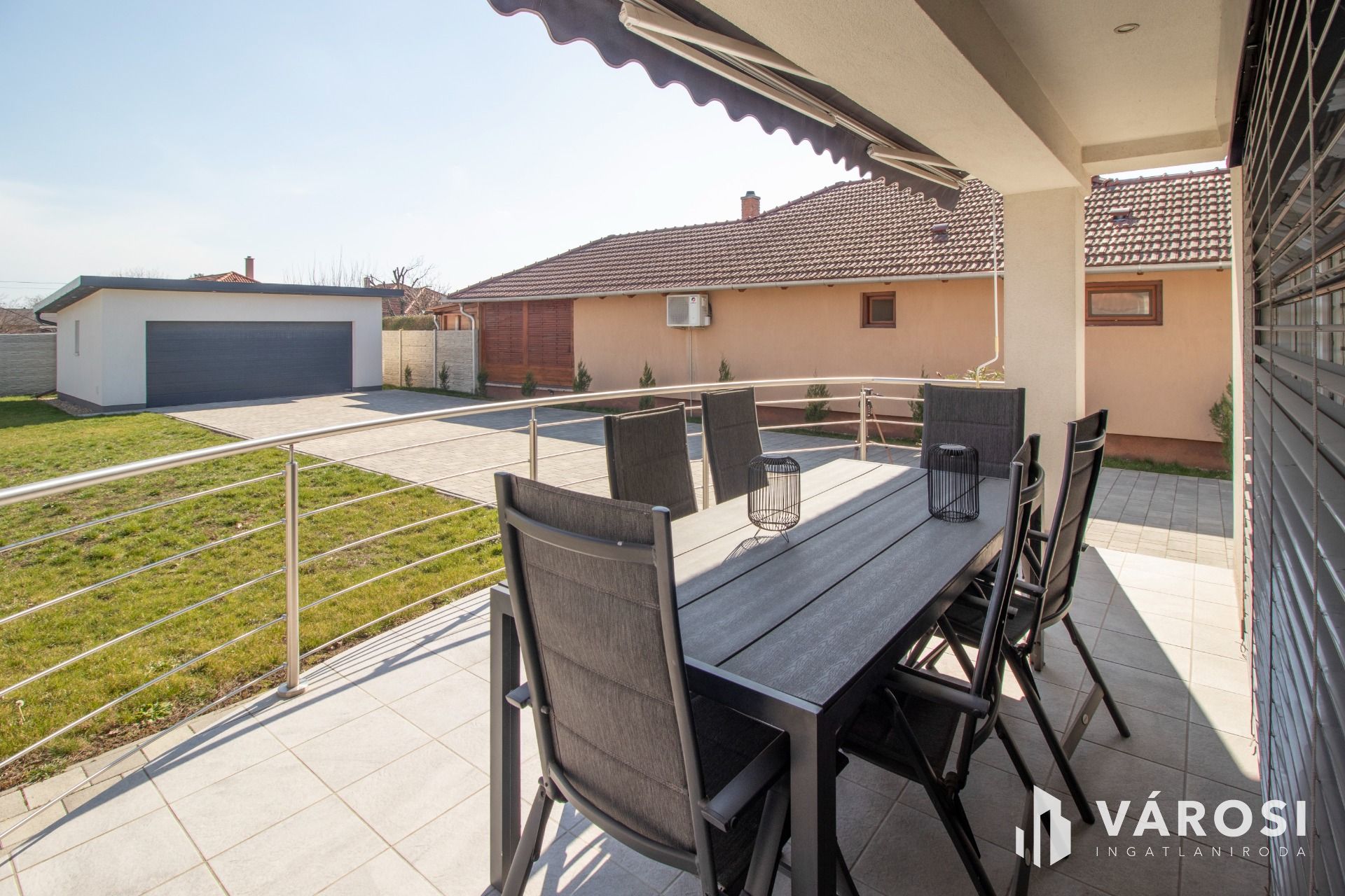 Az elektromos garázskapuval felszerelt, 35 m²-es dupla garázsban kényelmesen elfér két autó is, az udvar nagy része Frühwald térburkolattal burkolt, de maradt hely a kerti játszótérnek, illetve zöldfelületnek is.