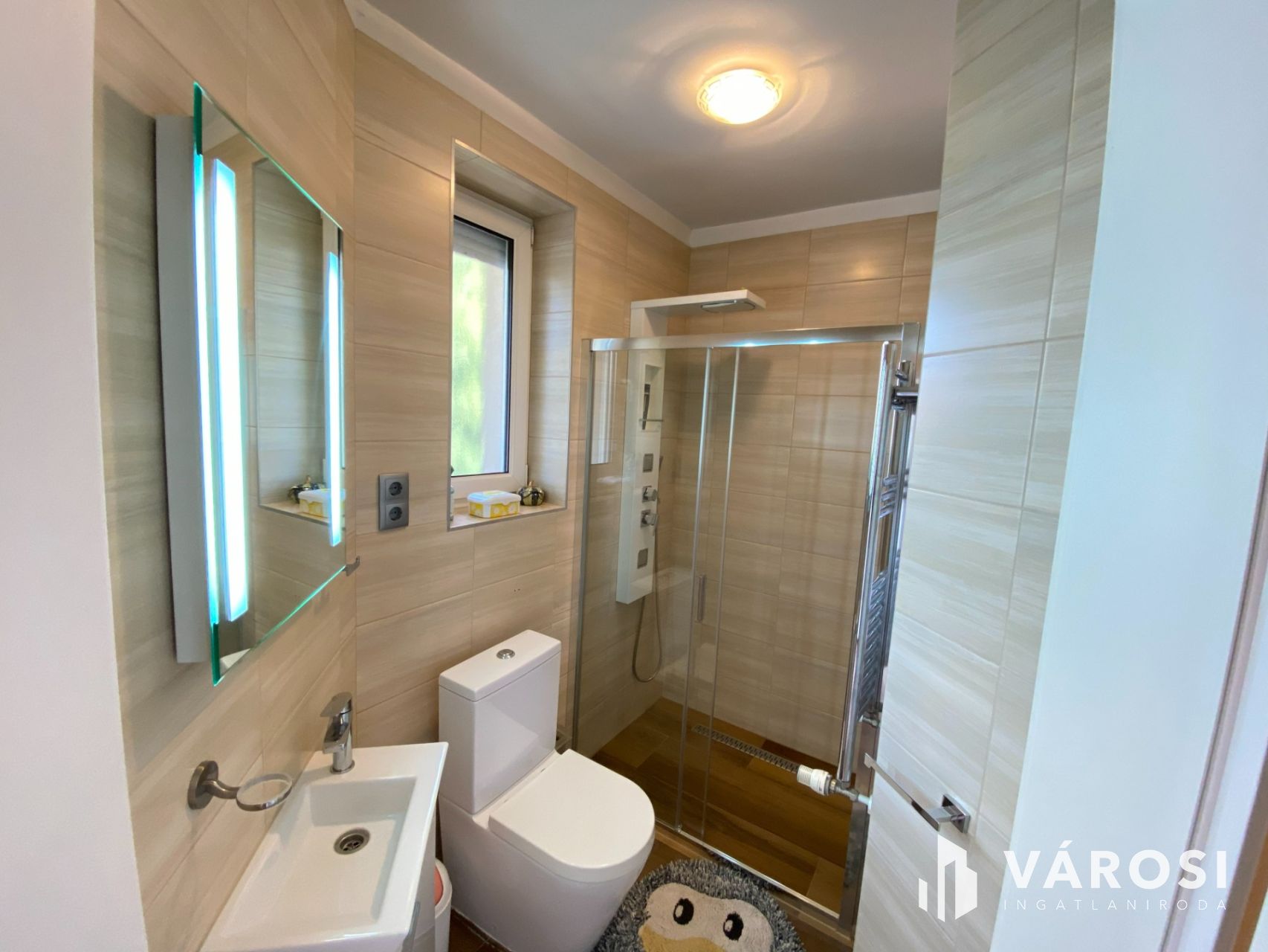 A ház központi része az amerikai konyhás nappali, amely méretéből adódóan valódi élettérként működik, ráadásul a kandalló még otthonosabb hangulatot ad. A földszinten négy külön nyíló szoba található, valamint két zuhanyzós fürdőszoba és egy infraszauna is helyet kapott, így akár nagyobb család vagy több generáció együttélése esetén is jól használható.